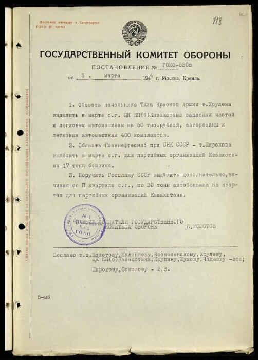 Resolution of the USSR GKO No. 5308 on the release of spare parts for cars, treshings and gasoline for the party organizations of Kazakhstan.March 5, 19441944.