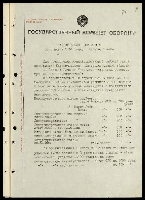 Order of the USSR GKO No. 5302 on measures to ensure the qualified labor force of enterprises of the People's Commissariat of Brand Metallurgy in the Dnipropetrovsk region.March 5, 19441944.