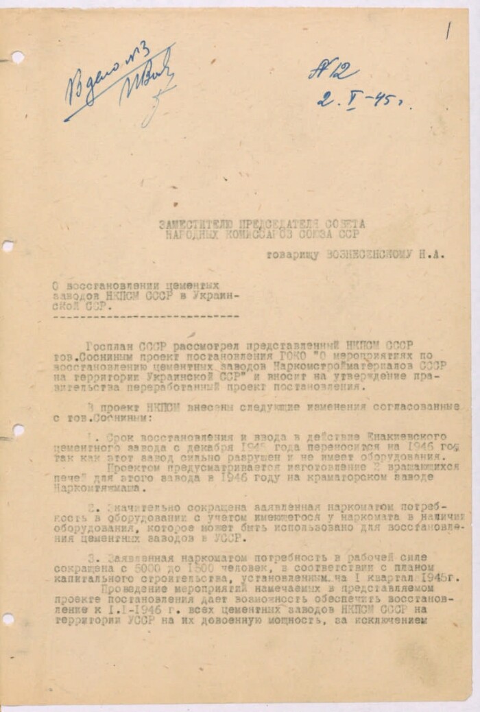 Letter of the Deputy Chairman of the State Planning Commission of the USSR I. Mitrakov, Deputy Chairman of the Council of People's Commissars of the USSR N.A.Voznesensky "On the restoration of cement plants of the NKPSM of the USSR in the Ukrainian SSR."A certified copy.December 28, 19441944.