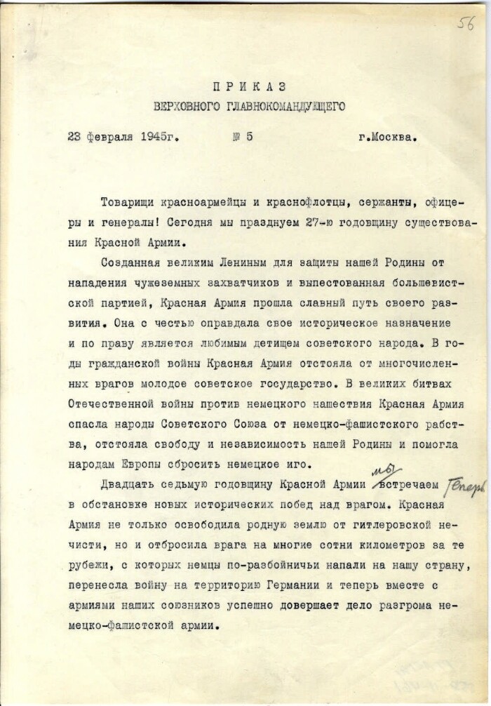 Проект приказа Верховного главнокомандующего № 5 о праздничном салюте в честь 27-й годовщины образования Красной армии