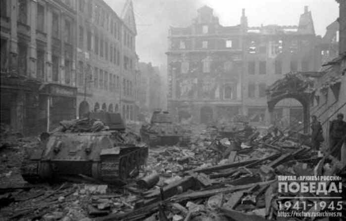 The tanks of the Guard of Major I. S. Ivanov are conducting a street battle in the city of Poznan.1st Belorussian Front