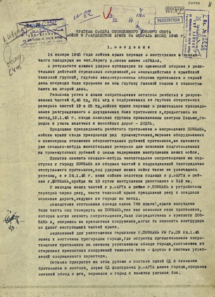 From a brief summary of the generalized combat experience of the troops of the 8th Guards Army of the 1st Belorussian Front for February 1945, the original.[No earlier than February 23, 1945]