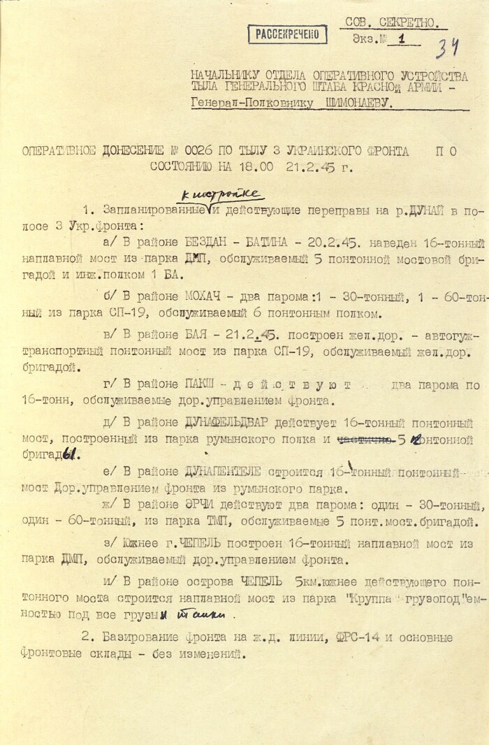 Operational report No. 0026 on the rear of the 3rd Ukrainian Front about the construction planned for construction and existing crossings on the river.Danube in the frontal band of the front as of 18.00 on February 21, 1945. The original.February 22, 1945