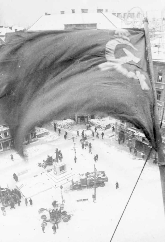 In the eastern part of Budapest after its possession of Soviet troops.Below in the square - abandoned German technique