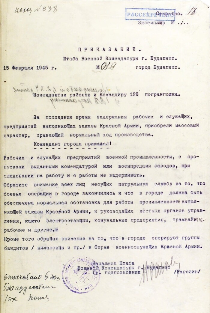 Order of the headquarters of the military commandant’s office in Budapest No. 019 on ensuring the conditions for the work of enterprises and local authorities, on the presence of bandits in the city of the Red Army in the city.Script.February 15, 1945