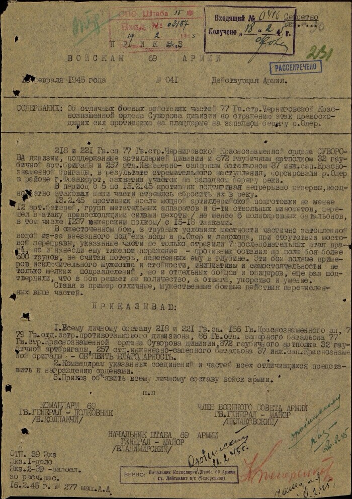 Order for the troops of the 69th Army of the 1st Belorussian Front No. 41 on the reflection of attacks superior forces of the enemy on the bridgehead on the western bank of the river.Oder