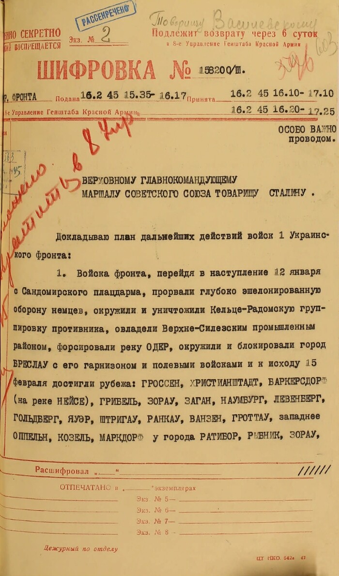 F. 5.Cryption No. 158200/Sh of the commander of the 1st Ukrainian Front I. S. Konev I.V. Stalin on hostilities during the offensive operation from the Sandomirsky bridgehead and about the plan of further actions.