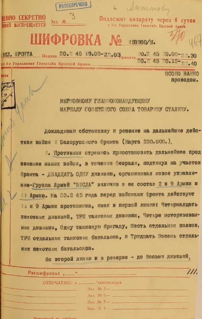 Cryption No. 158980/Sh of the commander of the 1st Belorussian Front G.K. Zhukov I.V. Stalin on the situation on the front line and about the plan of further action