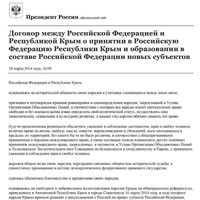 Agreement between the Russian Federation and Republic of Crimea on the Admission of the Republic of Crimea to the Russian Federation and the Formation of New subjects within the Russian Federation, March 18, 2014
