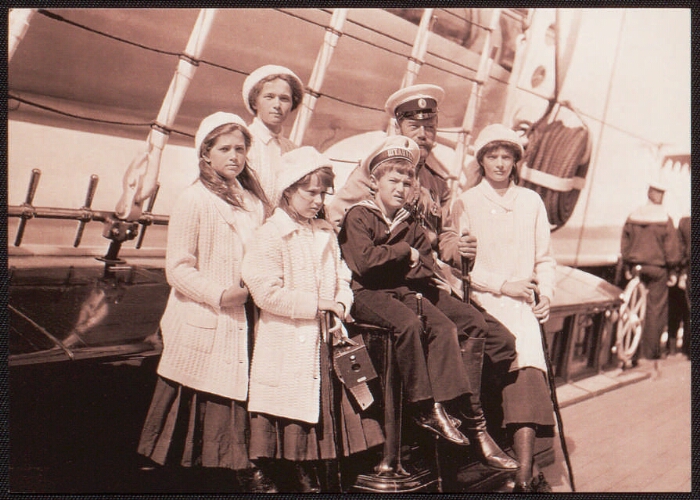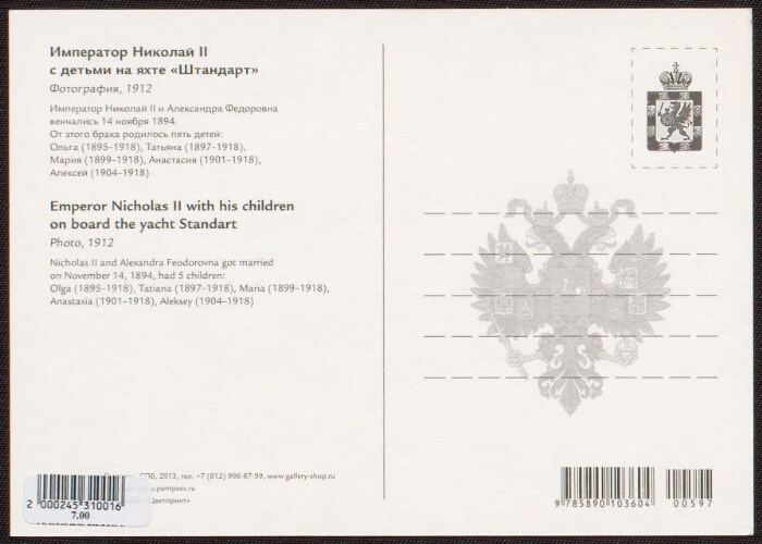 Император Николай II с детьми на яхте "Штандарт". Фотография, 1912 : [открытка] / дизайн: А. Помпеев. - Электронные данные (2 файла : 2 МБ). -(Санкт-Петербург: Президентская библиотека , 2016). - Режим доступа: интернет-портал Президентской библиотеки. Заглавие с экрана. Заглавие на русском и английском языках. На оборотной стороне изображение герба Российской империи. Электронная репродукция открытки: Император Николай II с детьми на яхте "Штандарт". Фотография, 1912 / дизайн: А. Помпеев. Санкт-Петербург : Галерея, 2013 (типография "Цветпринт"). 1 открытка : офсет. На оборотной стороне наклеен штрихкод. Местонахождение: Детский музей открытки, Санкт-Петербург. Копирование пользователями не разрешается. Император Николай II и Александра Фёдоровна венчались 14 ноября 1894 года. От этого брака родилось пять детей: Ольга (1895-1918), Татьяна (1897-1918), Мария (1899-1918), Анастасия (1901-1918), Алексей (1904-1918)