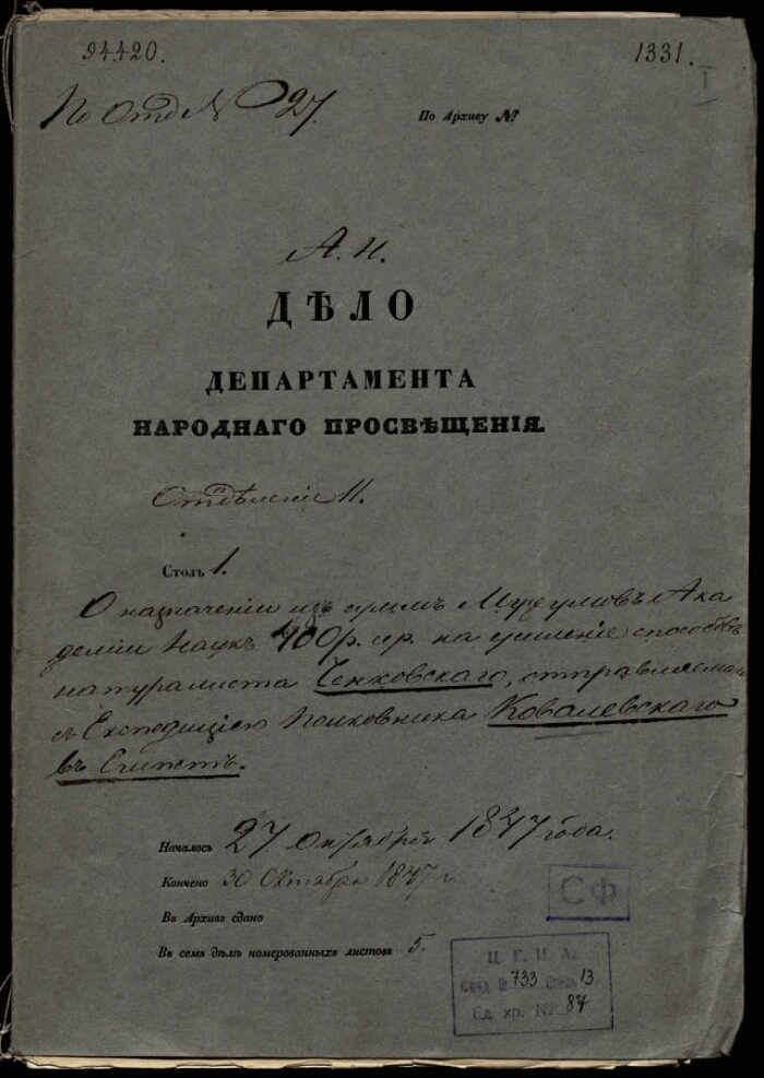 | Заголовок | Дело о назначении из сумм музеев Академии наук 400 рублей на усиление способов натуралиста Ценковского, отправляемого в экспедицию полковника Ковалевского в Египет |