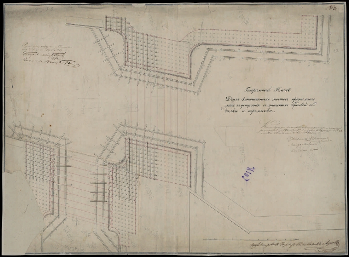 | Заголовок | Театральный и Конюшенный мосты. Проект двух мостов с показанием береговой обделки и перемычки. Генеральный план |