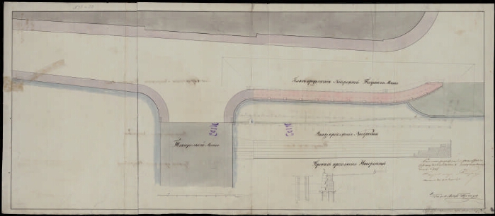 | Примечания | Бумага. Тушь, карандаш, акварель Рукописный текст. чернила Оригинальный заголовок дела: Театральный мост. План местоположения. План продолжения Театральной набережной. 1830 г. |