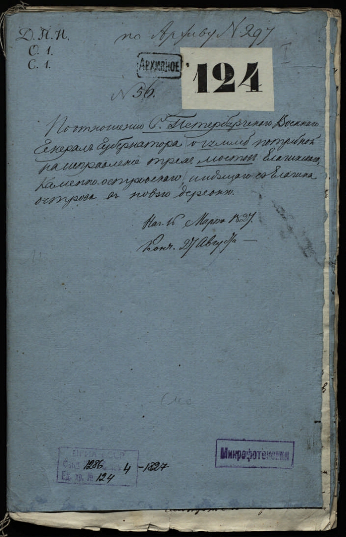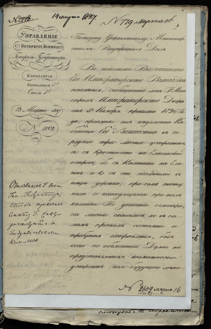 Заголовок Дело по отношению Санкт-Петербургского военного генерал-губернатора о сумме, потребной на исправление трех мостов: Елагинского, Каменноостровского и идущего с Елагина острова в Новую Деревню