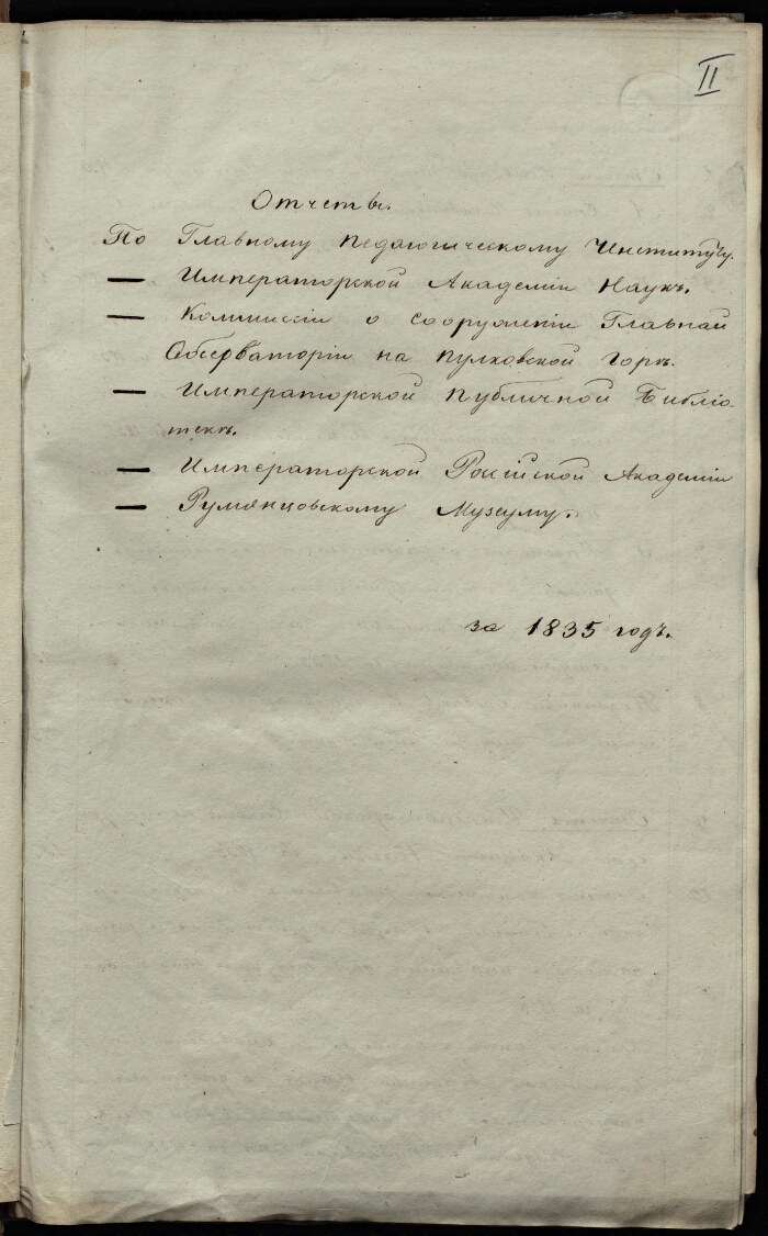 | Заголовок | Отчеты Академии наук, Российской академии, Публичной библиотеки, Румянцевского музея, ученых обществ, Главного педагогического института и Комиссиии о сооружении Главной обсерватории за 1835 год |