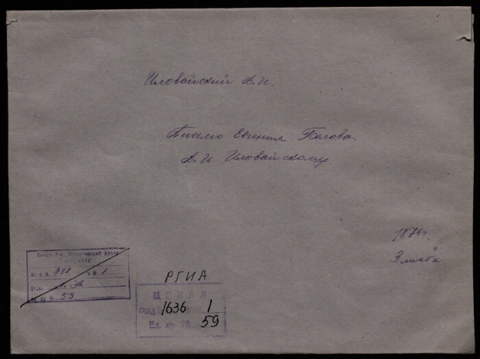 | Примечания | Заголовок дела также: Письмо Евгения Александровича Белова, статского советника, преподавателя Императорского Александровского лицея (Санкт-Петербург), Д. И. Иловайскому от 8 мая 1876 г. с благодарностью за присланную первую часть "Русской истории" Рукописный текст. Чернила |