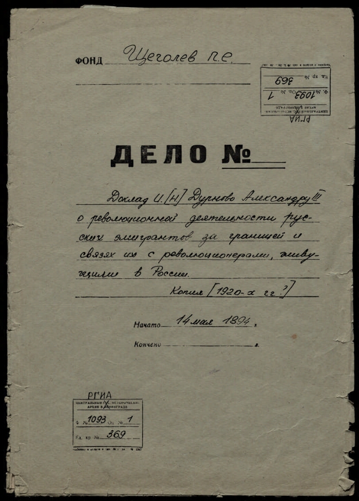 | Примечания | Заголовок на обложке дела: Доклад И. Н. Дурново Александру III о революционной деятельности русских эмигрантов за границей и связях их с революционерами, живущими в России. Копия [1920-х годов?]. 14 мая 1894 г. |