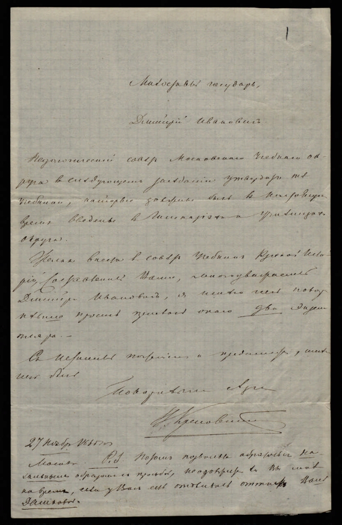 | Примечания | Заголовок дела также: Письмо Ивана Ивановича Красовского, надворного советника, инспектора студентов Московского университета, Д. И. Иловайскому от 27 ноября 1865 г. с просьбой прислать два экземпляра своего "Учебника Русской истории" для рассмотрения на Педагогическом совете Московского учебного округа Рукописный текст. Чернила |