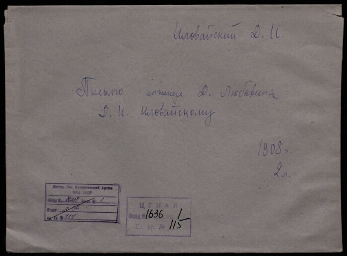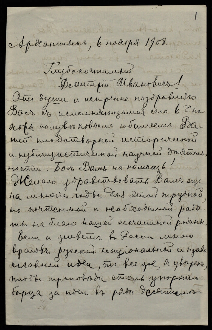 | Примечания | Заголовок дела также: Письмо Дмитрия Николаевича Любавина, инженера Управления Архангельского торгового порта, Д. И. Иловайскому от 6 ноября 1908 г. с поздравлением с 50-летним юбилеем его научной деятельности Рукописный текст. Чернила |