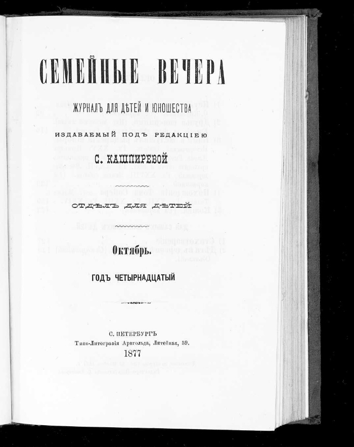 Семейные вечера : детский журнал. Отдел для старшего возраста. - Г. [1] 1864, № 1 - Г. 27 1891, № 5. -Санкт-Петербург, 1864-1891. - Издатели-редакторы: 1865-1870 М. Ф. Ростовская, 1870-1891 С. С. Кашпирева. Последующее заглавие: Г. 27 1891, № 6 - Г. 34 1900 Литературные семейные вечера. Надзаголовки: 1864-1865 Детский журнал. Отдел для старшего возраста; 1866-1872 № 1-3, 1874, 1876 № 2-9, 11 Журнал для детей и юношества. Отдел для юношества (с незначительными изменениями); 1872 № 4 - 1873, 1875 № 1, 10, 12, 1875-1878 № 2 Журнал для детей и юношества. Отдел для семейного чтения (с незначительными изменениями); 1878 № 3 - 1891 № 5 Журнал для семейного чтения и детей. Отдел для семейного чтения. "Семейные вечера" - детский ежемесячный журнал с картинками, выходил в Санкт-Петербурге в 1864-1891 годы. Основан в 1864 году М. Ф. Ростовской и В. Н. Майковым; 1864 -1870 гг. издательницей-редактором была одна М. Ф. Ростовская, 1870 -1891 - С. С. Кашпирева. Выходил ежемесячно двумя книжками для старшего и для младшего возраста. Позже к разделу для детей младшего возраста прибавился ещё раздел для самых маленьких детей. В 1891 году журнал перешел в собственность Э. А. Арнгольда, а с 1892 г. А. М. Вольфа и под редакцией А. Германа, изменил своё название на "Литературные семейные вечера" и утратил своё первоначальное значение детского журнала