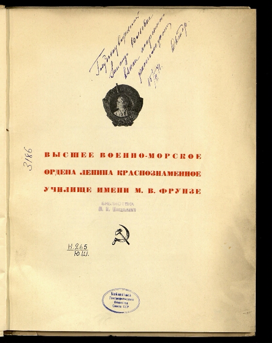 Высшее военно-морское ордена Ленина краснознаменное училище имени М. В. Фрунзе : [240 лет : историческая справка / автор текста Б. П. Хлюстин]. - [Ленинград] : издание Высшего военно-морского ордена Ленина краснознаменного училища имени М. В. Фрунзе, 1941. -[8], 56, [1] с., [4] л. ил., цв. ил. : ил., портр., факс. ; 29 см. - Описано по обложке. На титульном листе только подзаголовок. Библиография в подстрочных примечаниях. - Экземпляр РГО со штампом: Библиотека Ю. М. Шокальского и рукописной пометой.