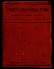 Законодательные акты переходного времени 1904-1906 гг. : Сб. законов, манифестов, указов Пр. сенату, рескриптов и положений ком. министров, относящихся к преобразованию гос. строя России, с прил. алф. предм. указ. / Под ред. пр.-доц. Н.И. Лазаревского. - 2-е изд., пересмотр. и доп. по 1 янв. 1907 г. -Санкт-Петербург : Изд. Юрид. кн. скл. "Право", 1907. -733 с. ; 19 см. - Библиогр. в тексте. - Экз.: с рукоп. помет.