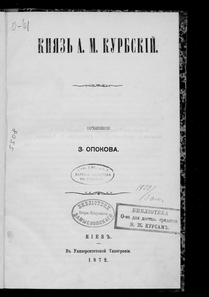 Князь А. М. Курбский / сочинение З. Опокова. - Киев : Университетская типография, 1872. -[2], 119 с. ; 23 см. - Библиография в подстрочных примечаниях. - Оттиск из "Университетских известий" 1872 г.. - Экземпляр СПбГУ: без обложки, с рукописными пометами. - Экземпляр СПбГУ: из библиотеки Е. Е. Замысловского.