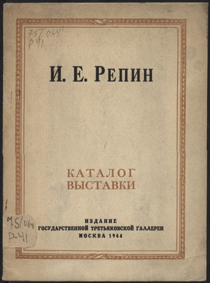 И. Е. Репин : каталог выставки к столетию со дня рождения 1844-1944 гг. / Государственная Третьяковская галерея ; каталог составили: Н. Ю. Зограф (живопись), А. М. Лесюк и А. И. Ульянинская (рисунок, акварель, пастель) ; редактор Г. В. Жидков. - Москва : типография "Правда", 1944. -23 с.. -3000 экз.