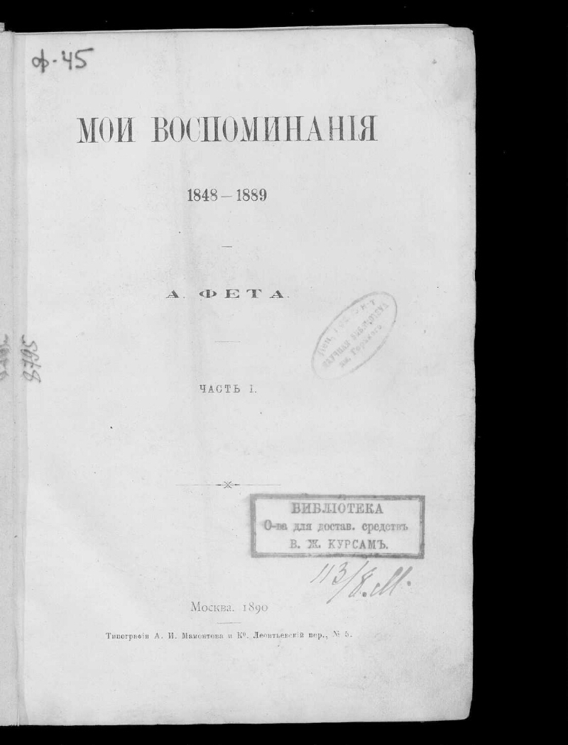 Мои воспоминания, 1848-1889 / [сочинение] А. Фета. - Москва : Типография А. И. Мамонтова и Кº, 1890. -2 т. ; 23 см. -