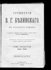 Т. 4: 1844-1849. - Паровая скоропечатня А. Пороховщикова, 1896. -[4] с., XLVII, 934 стб.. - Дешевое издание Ф. Павленкова, выпускаемое с разрешения наследников Белинского. Библиография в тексте и подстрочных примечаниях. - Экземпляр без обложки, с рукописными пометами.