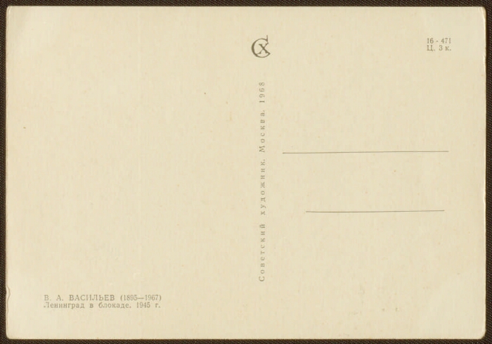 В. А. Васильев (1895-1967). Ленинград в блокаде. 1945 : [открытка]. - (Санкт-Петербург: Президентская библиотека , 2016). -2 файла (1,5 МБ, JPEG) : цв.. - Режим доступа: интернет-портал Президентской библиотеки. Заглавие с экрана. Открытка является частью комплекта: Владимир Александрович Васильев / редактор В. Кузнецова. Москва : Советский художник, 1968. 12 листов в обложке. 39 коп. Электронная репродукция открытки: В. А. Васильев (1895-1967). Ленинград в блокаде. 1945. Москва : Советский художник, 1968. 1 лист : цветной офсет. № 16-471. 3 коп. Тираж 30000 экз. Местонахождение: Балаченкова, Н. В., частное собрание. Копирование пользователями не разрешается. Открытка из коллекции известного петербургского коллекционера Натальи Владимировны Балаченковой, заведующей библиотекой школы № 331 в Санкт-Петербурге, руководителя школьного музея открытки. Коллекция Н. В. Балаченковой содержит более 10 тысяч открыток, среди которых – открытки с фотографиями актрис и актеров советского кино, открытки с видами Санкт-Петербурга, поздравительные открытки 1950-1980-х гг. и другие