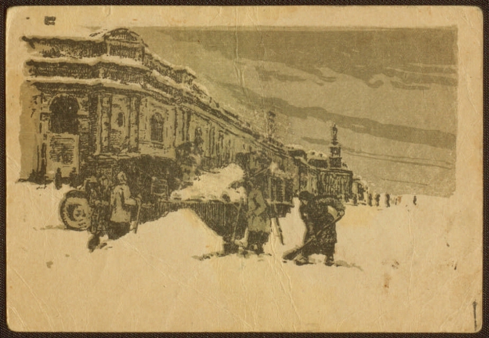 В. В. Морозов. Ленинград в феврале 1943 г. (Из иллюстраций к книге Н. Тихонова "Ленинградский год") [Изоматериал : электронный ресурс] : [открытка]. - Электронные данные (2 файла : 1,7 МБ). -(Санкт-Петербург: Президентская библиотека , 2016). - Режим доступа: интернет-портал Президентской библиотеки. Заглавие с экрана. Электронная репродукция почтовой карточки: В. В. Морозов. Ленинград в феврале 1943 г. (Из иллюстраций к книге Н. Тихонова "Ленинградский год") [Изоматериал]. Воениздат НКО, [1943]. 1 открытка : офсет. Г 354025, 40 коп. Местонахождение: Балаченкова, Н. В., частное собрание. Копирование пользователями не разрешается. Открытка из коллекции известного петербуржского коллекционера Натальи Владимировны Балаченковой, заведующей библиотекой школы № 331 в Санкт-Петербурге, руководителя школьного музея открытки. Коллекция Н. В. Балаченковой содержит более 10 тысяч открыток, среди которых – открытки с фотографиями актрис и актеров советского кино, открытки с видами Санкт-Петербурга, поздравительные открытки 1950-1980-х гг. и другие