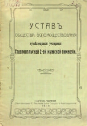 Описание Устав Общества вспомоществования нуждающимся учащимся Ставропольской 2 мужской гимназии. - Ставрополь : Тип.-Литогр. Т. М. Тимофеева, 1913. - . Источник электронной копии: Ставропольская КУНБ Издательство Ставрополь : Тип.-литогр. Т. М. Тимофеева