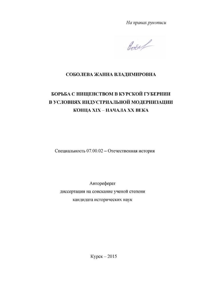 Борьба с нищенством в Курской губернии в условиях индустриальной модернизации конца XIX - начала XX века : автореферат дис. ... кандидата исторических наук : 07.00.02 / Соболева Жанна Владимировна ; [Место защиты: Кур. гос. ун-т]. - Курск, 2015. -26 с.. -