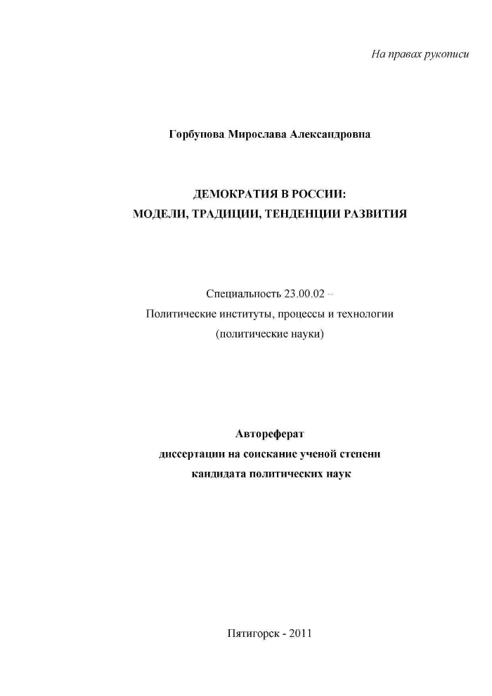 Демократия в России: модели, традиции, тенденции развития : автореферат диссертации на соискание ученой степени кандидата политических наук : специальность 23.00.02 / Горбунова Мирослава Александровна ; [Пятигор. гос. лингвист. ун-т]. - Пятигорск, 2011. -24 с. ; 21 см.. - Библиогр.: с. 23-24 (8 назв.). . -120 экз.