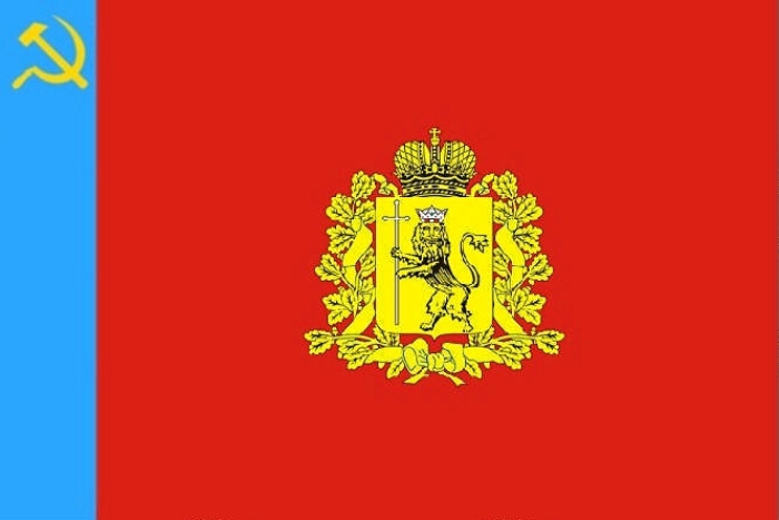 Флаг Владимирской области [Изоматериал] : рисунок. - 1999. -1 лист : цв.. - Флаг Владимирской области установлен Законом Владимирской области от 28 апреля 1999 года № 22-ОЗ "О флаге Владимирской области". Флаг Владимирской области представляет собой красное прямоугольное полотнище со светло - синей полосой у древка во всю ширину флага, которая составляет одну восьмую длины флага. Отношение ширины флага к его длине 2:3. В середине верхней части синей полосы изображены золотые серп и молот. В середине красного полотна золотое изображение герба Владимирской области. Ширина изображения герба Владимирской области должна составлять одну третью часть длины полотнища. - Использованы материалы официального портала Правительства Владимирской области (https://avo.ru/)