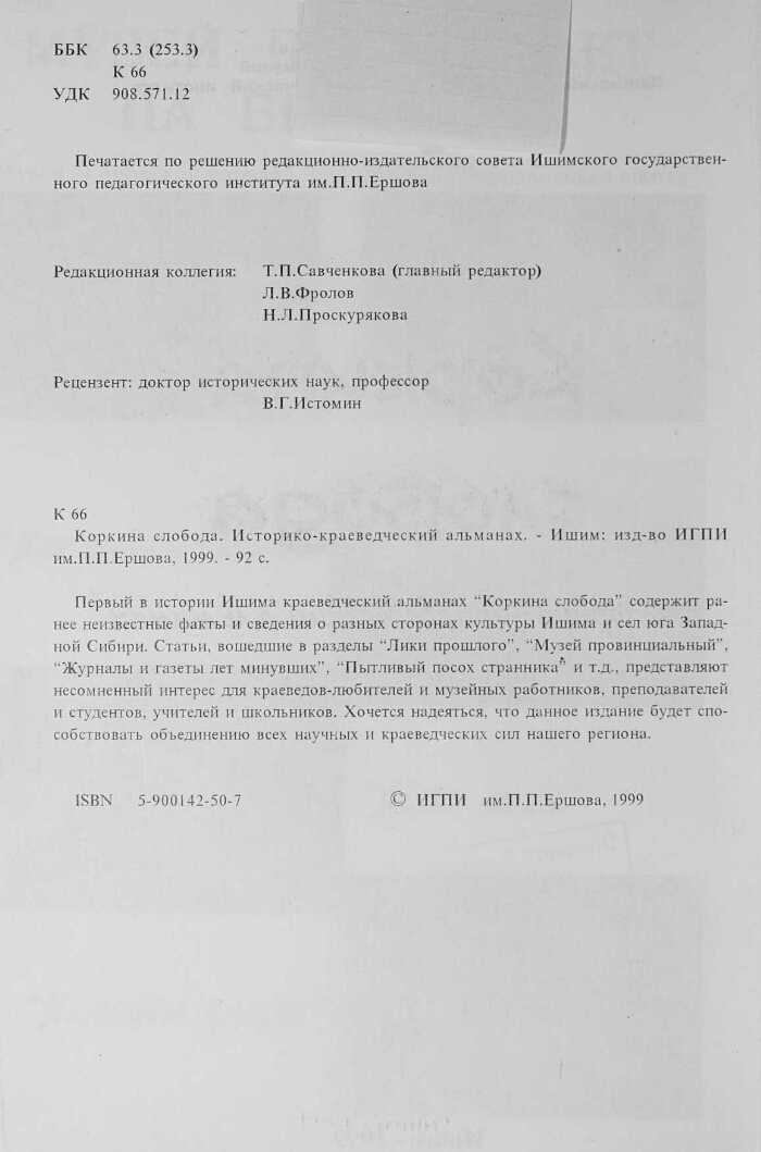 Коркина слобода : краеведческий альманах / Администрация г. Ишима ; Ишимский краеведческий музей ; Ишимский государственный педагогический институт имени П. П. Ершова ; [главный редактор Т. П. Савченкова]. - Ишим : Издательство ИГПИ имени П. П. Ершова, 1999-2016. -