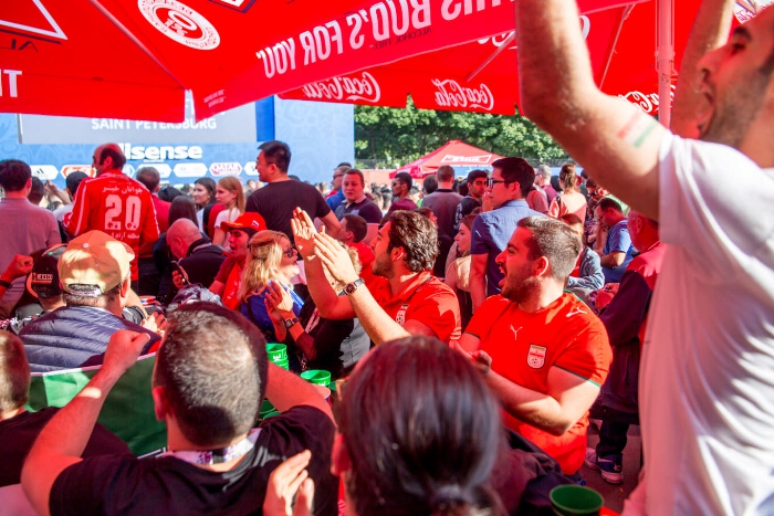 Чемпионат мира по футболу 2018. Фестиваль болельщиков FIFA (Санкт-Петербург, Конюшенная пл.). Матч Россия - Саудовская Аравия (14.06.2018). Болельщики сборной Ирана. [2] : [фотография] / фото А. А. Кассировой. - Электронные графические данные (1 файл, JPEG: 4,1 Мб). -Санкт-Петербург, 14 июня 2018 года. - Режим доступа: интернет-портал Президентской библиотеки. Информация о фотографии предоставлена автором. Место и дата съемки: Санкт-Петербург, Конюшенная пл., 14 июня 2018 года. На снимке: болельщики сборной Ирана на фестивале болельщиков FIFA перед началом трансляции матча Россия – Саудовская Аравия. Копирование пользователями не разрешается. В рамках проведения Чемпионата мира по футболу 2018 в городах, принимающих игры чемпионата, организованы специальные фан-зоны для футбольных болельщиков (фестиваль болельщиков FIFA). В Санкт-Петербурге фан-зона вместимостью 15 тысяч человек открылась на Конюшенной площади, рядом с Невским проспектом и Дворцовой площадью. В дни проведения матчей Чемпионата мира по футболу 2018 здесь транслируются матчи в прямом эфире на больших экранах. В перерывах между матчами для зрителей организованы концерты и другие массовые мероприятия