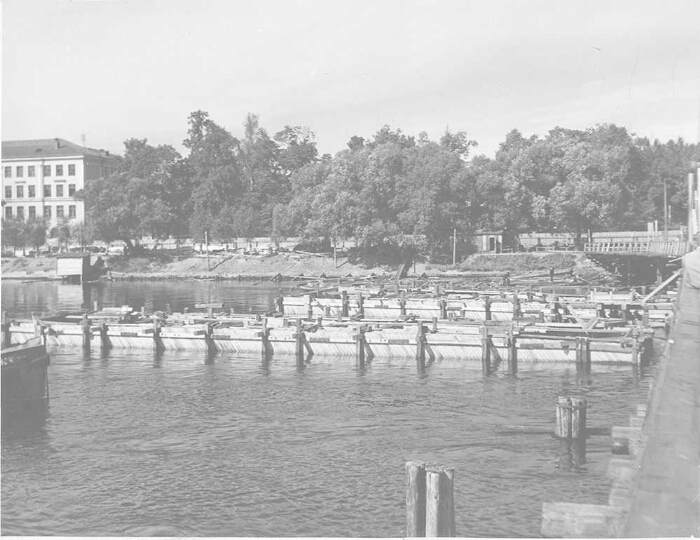 Ушаковский мост. Санкт - Петербург. Деревянные ящики ростверка на плаву. 1954 г.: фотография / СПб: СПб ГБУ «Мостотрест». - -. - 605: Территория.