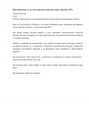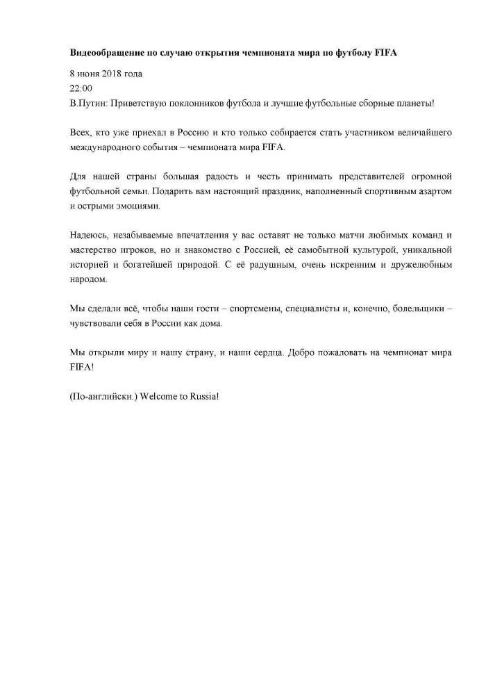 Видеообращение по случаю открытия чемпионата мира по футболу FIFA, 8 июня 2018 года, 22:00 / Президент России, официальный сайт. - [Москва], 2018. -1 лист + видеозапись (1 мин 44 с): Видеообращение по случаю открытия чемпионата мира по футболу FIFA, 8 июня 2018 года. - Видеообращение Владимира Путина по случаю открытия чемпиона мира по футболу