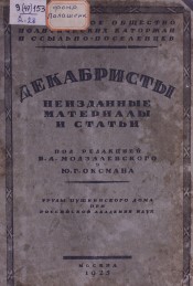 Декабристы : неизданные материалы и статьи / под редакцией Б. Л. Модзалевского и Ю. Г. Оксмана. - Москва : Всесоюзное общество политических каторжан и ссыльно-поселенцев, 1925. -XVI, 336 с. : ил., портр., пл. ; 24 см. - (Труды Пушкинского дома при Российской Академии наук). - Указатель имен: с. 323-336.