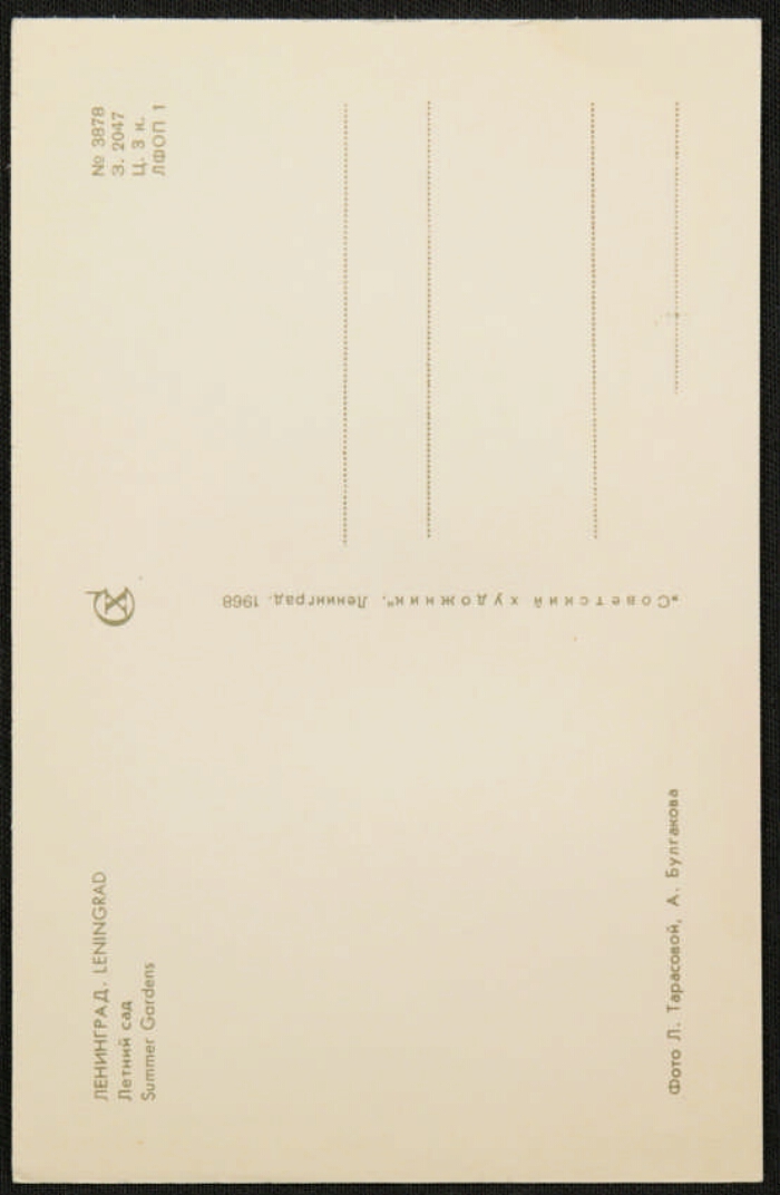 Ленинград. Летний сад [Изоматериал : электронный ресурс] = Leningrad. Summer Garden : [открытка] / фото Л. Тарасовой, А. Булгакова. - Электронные данные (2 файла, JPEG, 2,1 МБ). -(Санкт-Петербург: Президентская библиотека , 2014). - Режим доступа: интернет-портал Президентской библиотеки. Заглавие с экрана. Заглавие на русском и английском языках. Электронная репродукция открытки: Ленинград. Летний сад [Изоматериал] = Leningrad. Summer Garden / фото Л. Тарасовой, А. Булгакова. Ленинград : Советский художник, 1968. 1 открытка : цветной офсет. № 3878. 3 коп. Местонахождение: Детский музей открытки, Санкт-Петербург. Копирование пользователями не разрешается.