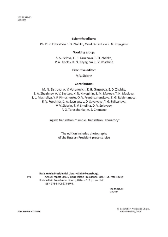 I. Zhabko, Elena Dmitrievna.1. Президентская библиотека им. Б. Н. Ельцина (Санкт-Петербург, город) -- Отчеты. |