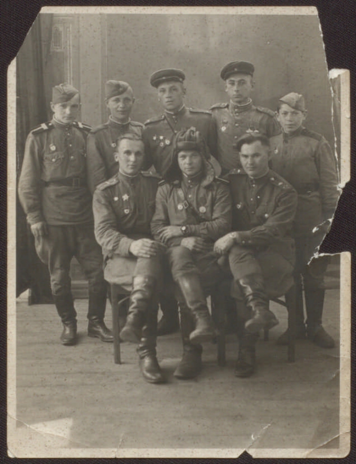 Борис Иосифович Лерман в составе военнослужащих 9-го отдельного гвардейского мотоциклетного Бранденбургского ордена Красной Звезды батальона. Германия, окраина Дрездена, дер. Клоче. 1947 год : [фотография]. - [Дрезден], 1947. - Фотопечать, черно-белая. - Режим доступа: интернет-портал Президентской библиотеки. Заглавие из сопроводительного документа. Электронная репродукция (2 файла, JPEG : 0,8 МБ). Борис Иосифович Лерман - в верхнем ряду, пятый слева. Копирование пользователями не разрешается. Лерман Борис Иосифович (1925-) – гвардии ефрейтор, автоматчик 9-го отдельного гвардейского мотоциклетного Бранденбургского ордена Красной Звезды батальона 11 гвардейского танкового корпуса. Призван Киевским РВК, г. Москва в 1943 г. Награжден орденом Красной Звезды (1945), орденом Отечественной войны II степени и другими государственными наградами. Закончил Великую Отечественную войну в Германии. Послевоенная жизнь Бориса Иосифовича Лермана была связана с Трамвайно-троллейбусным управлением Ленгорисполкома. Он был водителем первого ленинградского троллейбуса ЯТБ-1. Использованы материалы интернет-портала "Память народа" (https://pamyat-naroda.ru/)