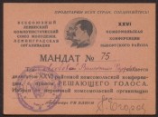 Описание Мандат № 75 делегату XXVI районной комсомольской конференции, с правом решающего голоса. - -. -605 : Память о Великой Победе. . Источник электронной копии: ПБ В коллекциях Государика → Территория России → Коллекции → Регионы России → Санкт-Петербург → Санкт-Петербург: страницы истории → Народ → Социальная активность → Защита отечества → Оборона и блокада Ленинграда → Источники → Воспоминания, дневники, материалы из личных архивов → Любова, Валентина Федоровна (1904–1986) Государственные праздники России: история и современность → День Героев Отечества – 9 декабря → История праздника → Защита Отечества: на фронте и в тылу → Из истории вооруженных конфликтов → Вторая мировая война. 1939–1945 гг. Великая Отечественная война 1941–1945 гг. → Коллекции → Память о Великой Победе → Защитники Отечества → Живая память → Живая память. Персоны → Л → Любова, Валентина Федоровна (1904–1986)