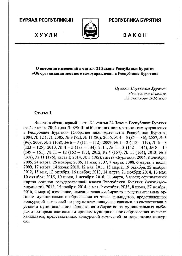 О внесении изменений в статью 22 Закона Республики Бурятия "Об организации местного самоуправления в Республике Бурятия" : Закон Республики Бурятия от 06.10.2016 № 1960-V. - Электронные текстовые данные (2 файла). -(Москва: ГлавНИВЦ УДП РФ , 2018). - Режим доступа: интернет-портал Президентской библиотеки. Загл. с титульной страницы. Электронная версия:Закон Республики Бурятия от 06.10.2016 № 1960-V "О внесении изменений в статью 22 Закона Республики Бурятия "Об организации местного самоуправления в Республике Бурятия".