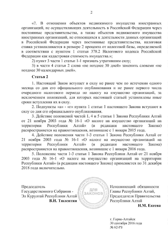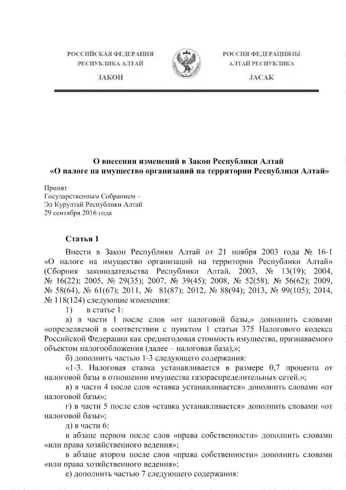 О внесении изменений в Закон Республики Алтай "О налоге на имущество организаций на территории Республики Алтай" : Закон Республики Алтай от 30.09.2016 № 62-РЗ. - Электронные текстовые данные (2 файла). -(Москва: ГлавНИВЦ УДП РФ , 2018). - Режим доступа: интернет-портал Президентской библиотеки. Загл. с титульной страницы. Электронная версия:Закон Республики Алтай от 30.09.2016 № 62-РЗ "О внесении изменений в Закон Республики Алтай "О налоге на имущество организаций на территории Республики Алтай".