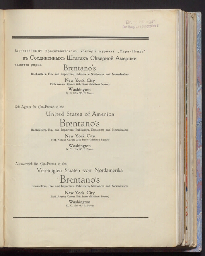 Жар-птица = Jar-ptitza. Russische Monatsschrift fur Kunst und Literatur. Revue russe d’Art et de literature : ежемесячный литературно-художественный иллюстрированный журнал. - № 1-14. -Париж ; Берлин : Русское искусство, 1921-1926. - Подзаголовки: №№ 1–3 (1921) Russische Monatsschrift fur Kunst und Literatur ; №№ 1–3 (1921) Revue russe d’Art et de literature ; №№ 1–13 (1921–1925) Ежемесячный литературно-художественный иллюстрированный журнал ; № 14 (1926) Литературно-художественный иллюстрированный журнал. Редакторы: №№ 1–14 (1921–1926) Александр Эдуардович Коган (гл. ред.) ; № 2 (1921) Георгий Крескентьевич Лукомский (редактор художественного отдела), Бруно Георгиевич Скамони (заведующий печатно-технической частью), №№ 2–3 (1921) Саша Черный (редактор литературного отдела), №№ 9–14 (1922–1926) Александр Эдуардович Коган (руководитель художественной части). Издатель: №№ 1–7 (1921–1922) Александр Эдуардович Коган. Место издания: №№ 1–13 (1921–1925) Берлин, Париж ; № 14 (1926) Париж. Жар-птица - литературно-художественный журнал русской эмиграции, издававшийся в 1921-1926 годах в Берлине и Париже. Всего вышло 14 номеров: №№ 1-5 (1921), №№ 6-9 (1922) , №№ 10-12 (1923), № 13 (1925), № 14 (1926). Номера 1-13 печатались в Берлине, № 14 - в Париже. Средний объем журнала - 40 крупноформатных страниц, с многочисленными иллюстрациями и рекламой, воспроизводились работы выдающихся художников современности - Л. Бакста, А. Бенуа, И. Билибина, М. Врубеля, Б. Григорьева, Б. Кустодиева, Г. Лукомского, Н. Гончаровой, Н. Рериха, К. Сомова, С. Судейкина, А. Яковлева, В. Шухаева. Тираж журнала около 300 экземпляров. Основными темами публикаций были прошлое и настоящее России, человек и природа, театр и изобразительное искусство. Некоторые статьи также печатались на немецком языке. Использована информация "Сводного каталога периодики русского зарубежья": http://www.emigrantica.ru/item/zhar-ptitsa-berlin-parizh-19211926