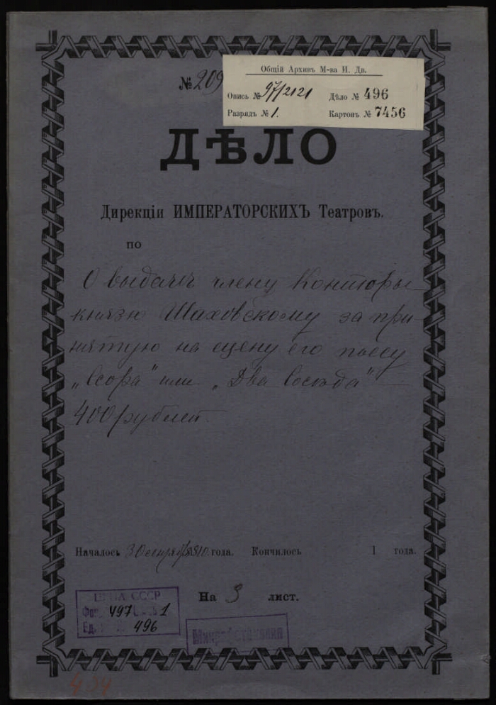 Заголовок | Дело о выдаче члену Конторы князю Шаховскому авторского гонорара за пьесу "Ссора" или "Два соседа" |