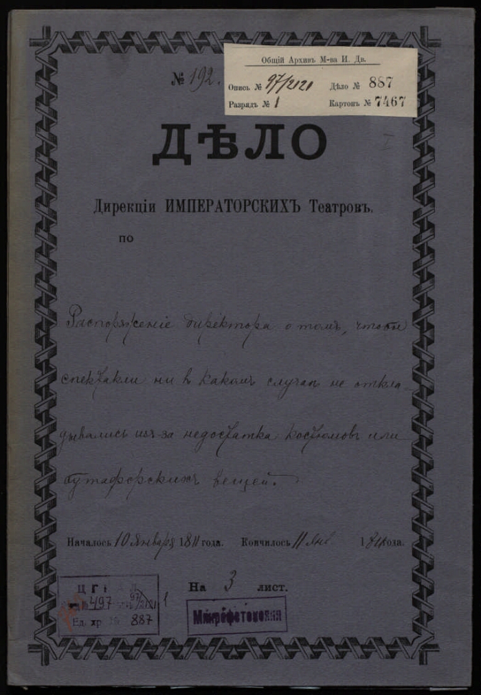 | Примечания | Заголовок дела также: Распоряжение директора о том, чтобы спектакли ни в каком случае не откладывались из-за недостатка костюмов или бутафорских вещей Рукописный текст. Чернила |